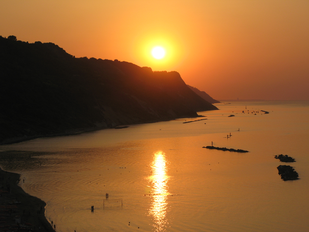 Il tramonto è stato infatti comunque spettacolare, con il sole che dapprima incendia il mare con il suo riflesso dorato, quindi “tocca” il promontorio più alto del Monte San Bartolo per poi riapparire di fianco ad esso, infine scivola lungo le estreme pendici fino a tramontare sulla costa romagnola, oramai vicinissimo alla sagoma del colle che ne nasconderà la vista nei prossimi mesi.